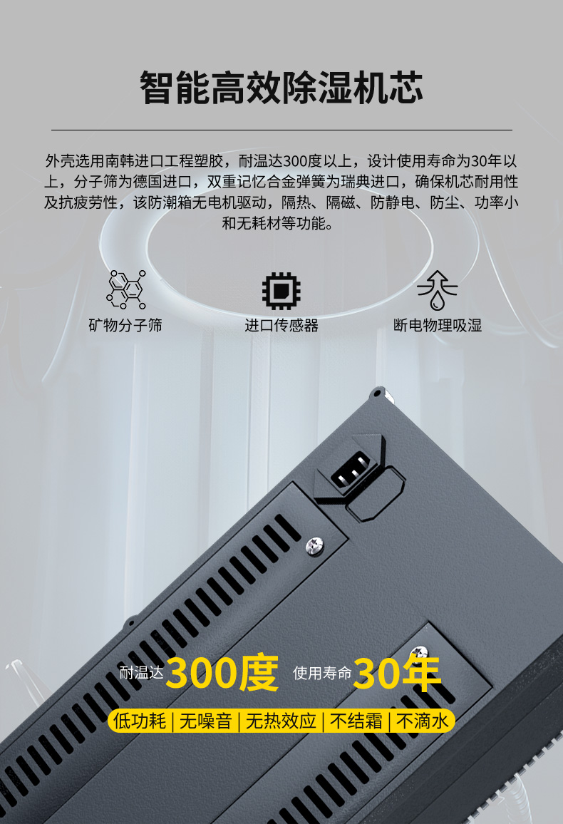 控濕機(jī)芯:外殼選用南韓工程塑膠,耐溫達(dá)300度以上,設(shè)計(jì)使用壽命為30年以上,分子篩為德國(guó)進(jìn)口,雙重記憶合金彈簧為瑞典進(jìn)口,確保機(jī)芯耐用性及抗疲勞性; 該防潮箱無(wú)電機(jī)驅(qū)動(dòng),隔熱﹑隔磁﹑防靜電﹑防塵﹑防盜﹑功率小和無(wú)耗材等功能,因此,該防潮箱具有環(huán)保﹑節(jié)能﹑靜音﹑無(wú)污染、不滴水。